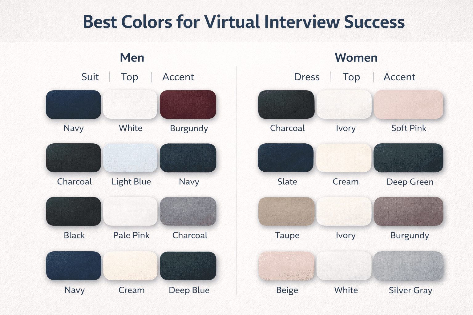 Camera-friendly interview colors: Navy blue, charcoal grey, light blue, and white are the safest colors for virtual interviews. These provide excellent contrast against most backgrounds, photograph well in HD cameras, and appear professional across all skin tones. Avoid patterns, stripes, bright colors, and pure black which cause camera distortion or washing out.